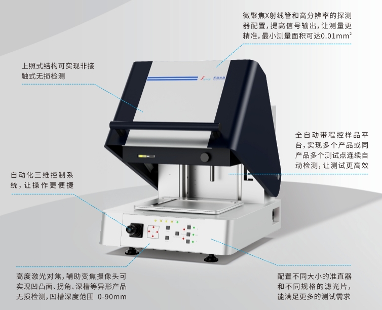EDXThick800是一款全新上照式多功能自動微區(qū)X熒光膜厚測試儀,既滿足原有微小和復(fù)雜形態(tài)樣品的膜厚檢測功能,又可滿足有害元素檢測及輕元素成分分析;搭載自動化的X/Y/Z軸的三維系統(tǒng)、雙激光定位和保護(hù)系統(tǒng),可多點位編程測試,被廣泛應(yīng)用于各類產(chǎn)品的質(zhì)量管控、來料檢驗和對生產(chǎn)工藝控制的測量。