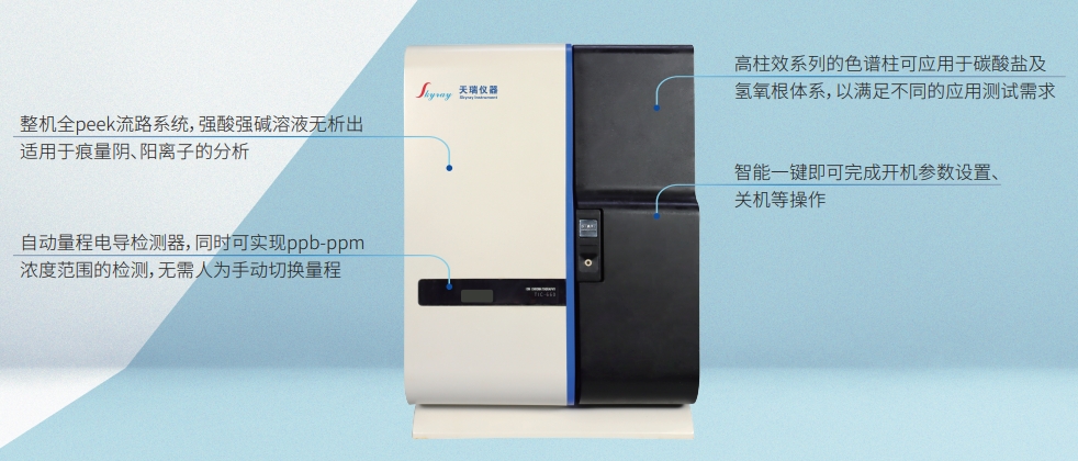 TIC-680離子色譜儀是天瑞儀器在TIC-600的基礎(chǔ)上,推出的全新一款具有雙極電路、電磁閥進(jìn)樣、可搭載自動(dòng)淋洗液發(fā)生器、同時(shí)可兼容安培檢測(cè)器、紫外檢測(cè)器等,滿足不同的樣品測(cè)試需求。該款產(chǎn)品搭載淋洗液自動(dòng)發(fā)生器可實(shí)現(xiàn)梯度洗脫,滿足新國(guó)標(biāo)GB5750.10-2023生活飲用水中消毒副產(chǎn)物的測(cè)定;除此之外該產(chǎn)品既能滿足常規(guī)陰離子、陽(yáng)離子、氰根及小分子有機(jī)酸的分析,也能與AFS、ICP、ICP-MS聯(lián)用進(jìn)行形態(tài)分析;普遍適用于環(huán)境、疾控、食品、電子、化工、醫(yī)藥、礦冶等領(lǐng)域。
