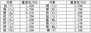 連續(xù)測試6份平行樣品,計(jì)算6次測試數(shù)據(jù)的相對標(biāo)準(zhǔn)偏差,即為重復(fù)性數(shù)據(jù),結(jié)果見下表