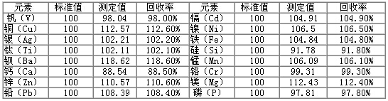 采用本方法測試潤滑油金屬含量光譜分析標(biāo)準(zhǔn)物質(zhì)GBW(E)130129、GBW(E)130132,對比實(shí)際測定值與標(biāo)準(zhǔn)值,得出實(shí)際測試的回收率,得到準(zhǔn)確度數(shù)據(jù),結(jié)果見下表