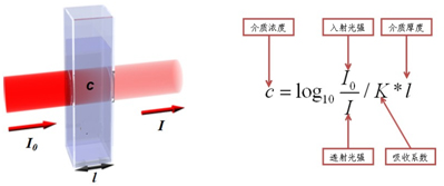 光度比色法主要是根據(jù)朗伯比爾定律,一束單色光照射于一吸收介質(zhì)表面,在通過一定厚度的介質(zhì)后,由于介質(zhì)吸收了一部分光能,透射光的強度就要減弱。吸收介質(zhì)的濃度愈大,介質(zhì)的厚度愈大,則光強度的減弱愈顯著。