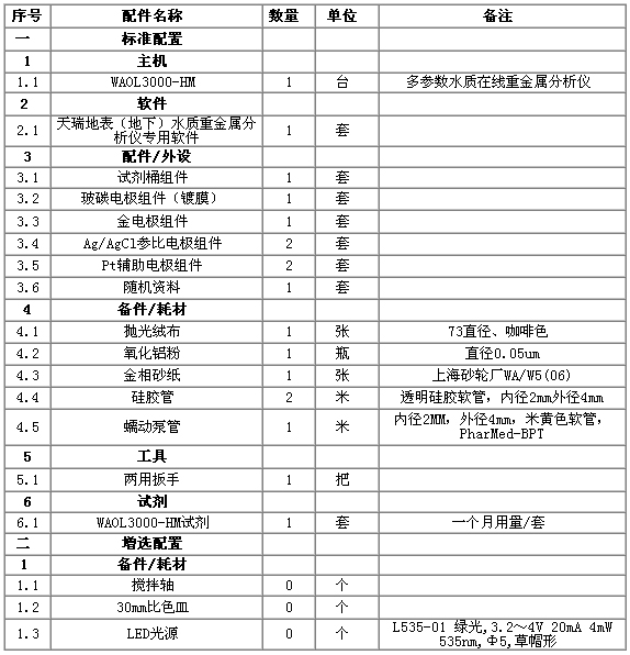 綜上所述,有色金屬礦業(yè)對環(huán)境的重金屬污染包括了大氣、水體和土壤三個方面。因此,為了全面監(jiān)測有色金屬礦業(yè)環(huán)境重金屬監(jiān)測系統(tǒng)包括:大氣、水體和土壤三個部分,選用監(jiān)測儀器如下表: