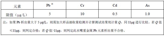 (1)GB/T 17219-1998《生活飲用水輸配水設備及防護材料的安全性評價標準》主要對水嘴中鎘、鉛、砷、汞、鉻等十種重金屬元素的析出量予以限定,限定要求如表1所示: