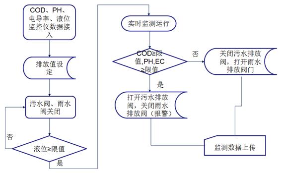 監(jiān)測系統(tǒng)控制采樣單元將水樣導入監(jiān)測室,并啟動監(jiān)測水質(zhì)的COD、pH、電導率等常規(guī)參數(shù)。達標雨水通過電控閥門排入市政雨水管網(wǎng),一旦超標電控閥門關閉,禁止雨水排入市政雨水管網(wǎng),并通過水泵將超標雨水泵入企業(yè)污水處理系統(tǒng)處理,達標后排放至市政污水管網(wǎng)。同時所有監(jiān)測數(shù)據(jù)經(jīng)由數(shù)據(jù)采集單元將數(shù)據(jù)統(tǒng)計后,由傳輸設備傳輸至企業(yè)監(jiān)測中心或環(huán)保局,由此完成對雨水排放自動、實時、連續(xù)監(jiān)控。