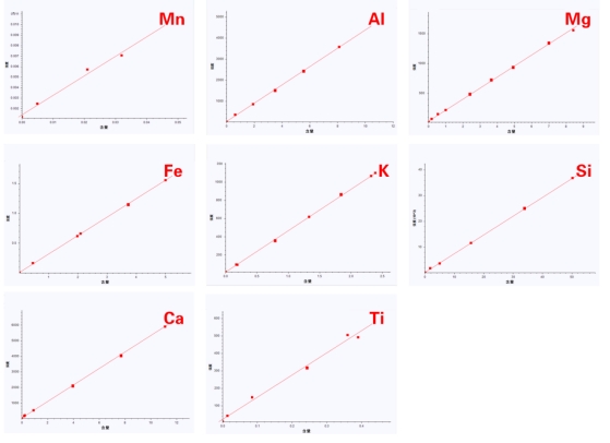 設(shè)定適當(dāng)?shù)臏y量條件,使用X射線熒光光譜儀掃描一系列含量已知的石墨標(biāo)準(zhǔn)物質(zhì)或石墨二次標(biāo)樣,該系列樣品中需關(guān)注元素Mg、Al、Si、K、Ca、Ti、Mn、Fe等元素含量與強(qiáng)度的一次線性校正工作曲線。然后,對未知石墨樣品進(jìn)行測量。
