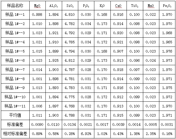 圖3為石墨1#樣品的X射線熒光譜圖,從譜圖可知,樣品的含有少量Mg、Al、Si、P、K、Ca、Ti、Mn、Fe等元素。使用該樣品進(jìn)行重復(fù)性測試之后,檢測結(jié)果中計算了對應(yīng)元素的氧化物含量,測試結(jié)果中呈現(xiàn)出較好的重復(fù)性。