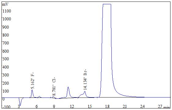準(zhǔn)確稱(chēng)取0.2g(精確至0.0001g)試樣,采用氧彈燃燒后冷卻定容,經(jīng)0.22μm的水系濾膜過(guò)濾后上機(jī)得到測(cè)試譜圖如下圖2、圖3所示。