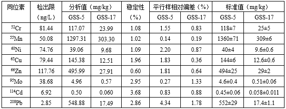在優(yōu)化的儀器工作參數(shù)下,建立標(biāo)準(zhǔn)溶液工作曲線(線性相關(guān)系數(shù)達(dá)0.999以上),再分別取待測(cè)溶液上清液上機(jī)測(cè)試。其中:取兩個(gè)平行樣測(cè)試結(jié)果的平均值為分析值;對(duì)樣品空白溶液平行測(cè)定11次,計(jì)算11次測(cè)試結(jié)果的SD,以3×SD/k(k為標(biāo)準(zhǔn)溶液工作曲線的斜率)對(duì)應(yīng)的值為方法檢出限。取一份GSS-17樣品溶液進(jìn)行穩(wěn)定性考查,即間隔2min采集一個(gè)數(shù)據(jù),連續(xù)采集7組數(shù)據(jù),計(jì)算7組數(shù)據(jù)的RSD,作為穩(wěn)定性指標(biāo)。所得實(shí)驗(yàn)數(shù)據(jù)見表4。
